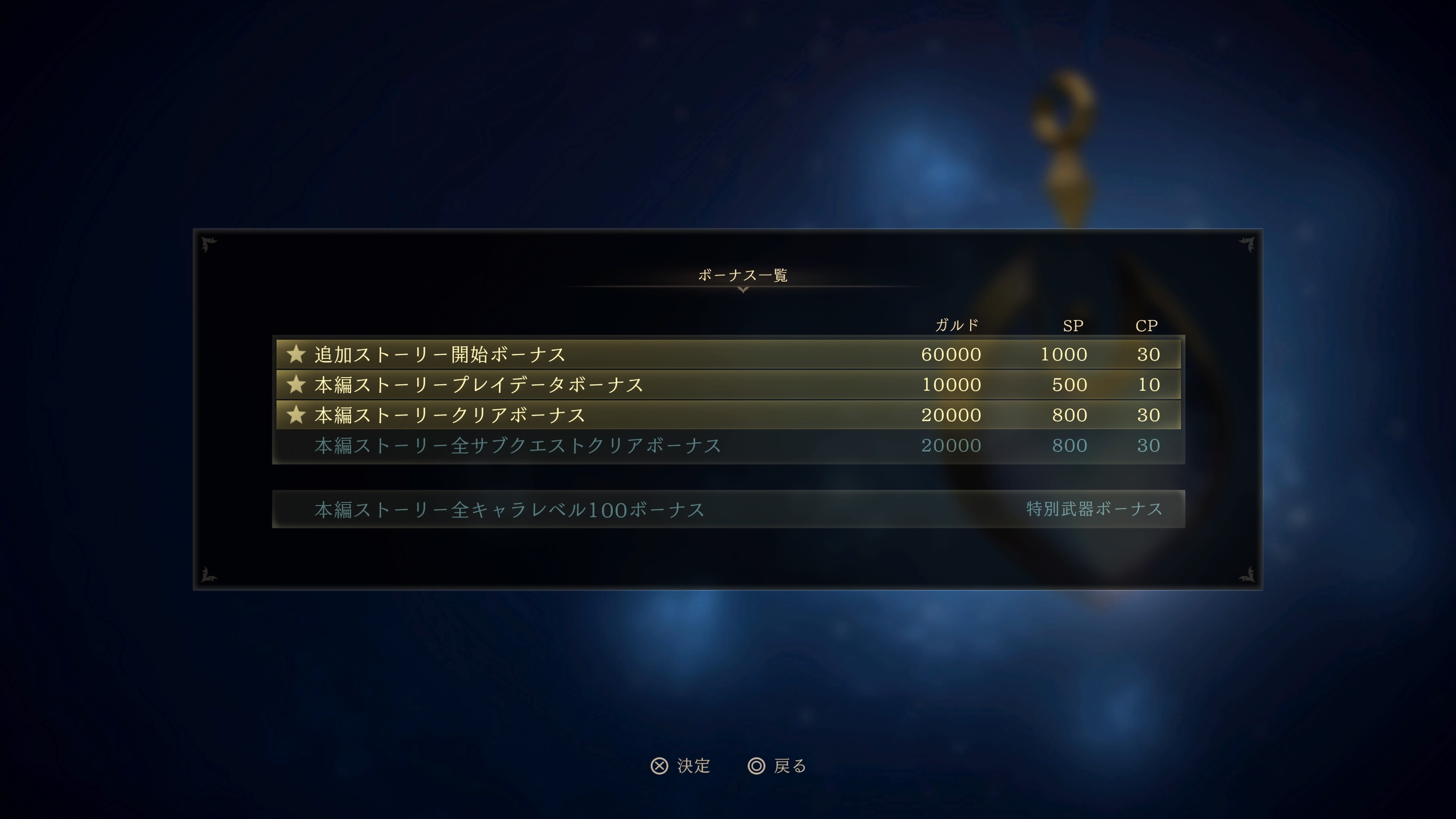 自分の場合は、全キャラクターのレベル100と、サブクエストを全て終わらせていないので、その二点だけボーナスが貰えません