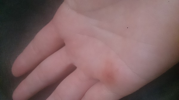 ちょっと見ずらいかもしれないけれど、小指の下に約2センチ程のアザができました(照)