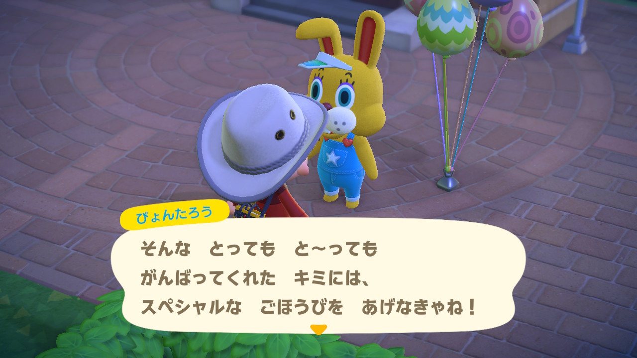 まぁ、そうしたらですね・・・本日、広場に現れたぴょんたろうと会話を始めたら、イースターのレシピコンプリート報酬として、スティックを貰えて